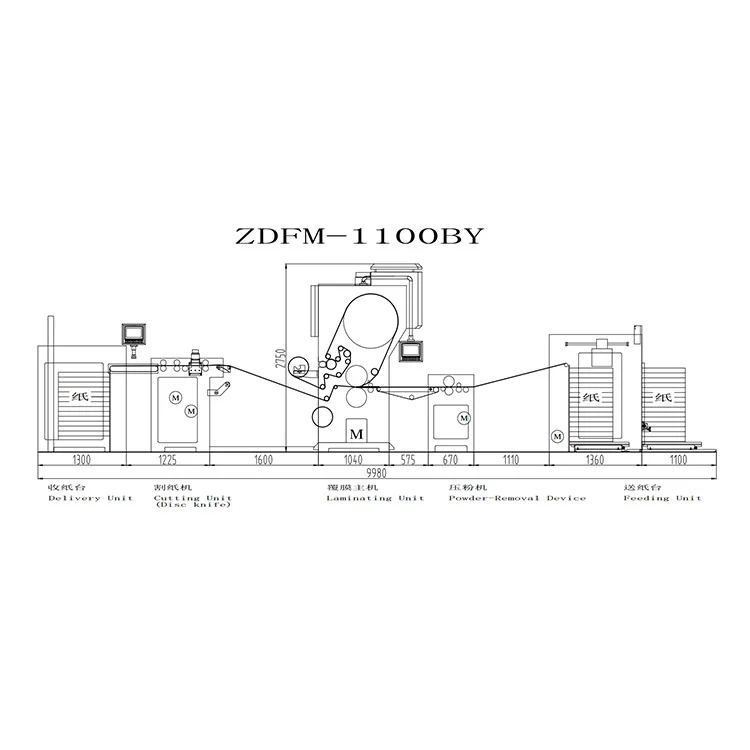Çap məhsulu kağız daşıyıcısı ilə müəyyən edilmiş ön yerə daşınır və sonra içəriyə verilir. Film qidalanma qurğusu ilə qidalanır, yapışqanla örtülür və qurudulur. Kağız və film elektromaqnit qızdırıcı rulonu və rezin sıxma rulonu ilə təzyiqə məruz qalır və sonra laminatlanır. Bıçaq diskindən və ya aşındırıcı kağız çarxından istifadə edərək kağızın üst-üstə düşən hissəsini kəsin və kağızı çəkmə rulonu ilə ayırın. Sonra ayrılan hazır məhsullar vahid hazır məhsulların yığılması üçün konveyer lentində avtomatik kağız qəbulu və yığma sisteminə göndərilir.
